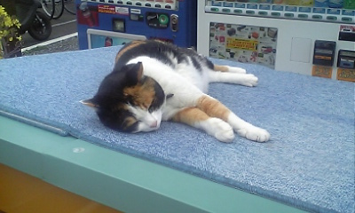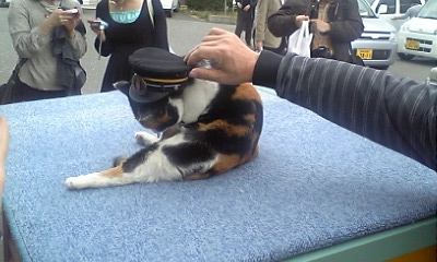 列車は30分ほどで終点の貴志に着く。駅前ではスーパー駅長のタマがお出迎え。この猫さん、相当な人気者です。ただ、平日ということもあってか、脱力モード全開です。